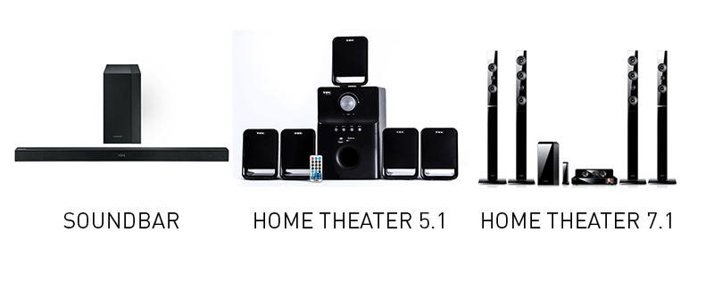 - 7.1 or 7.2 systems: two front speakers, one center speaker, one subwoofer, four rear speakers.